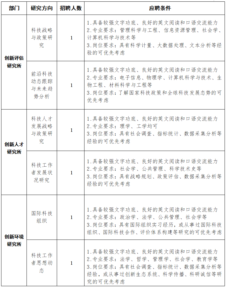 中国科协创新战略研究院2026年博士后招聘公告